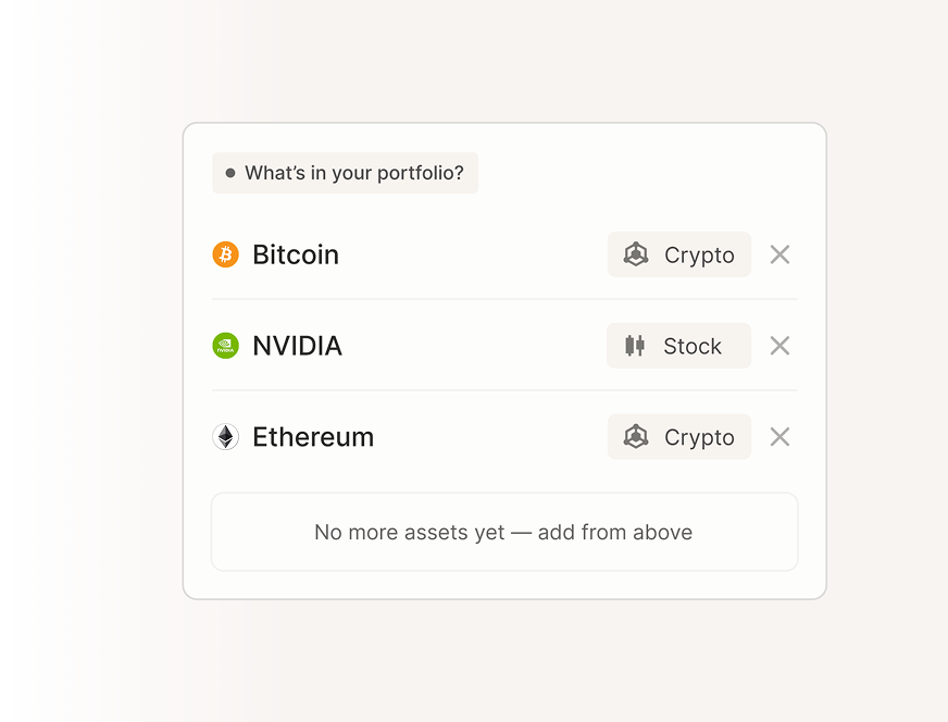 Link your brokerage accounts securely via Plaid, or upload your holdings manually. Then tell us your experience level and investment